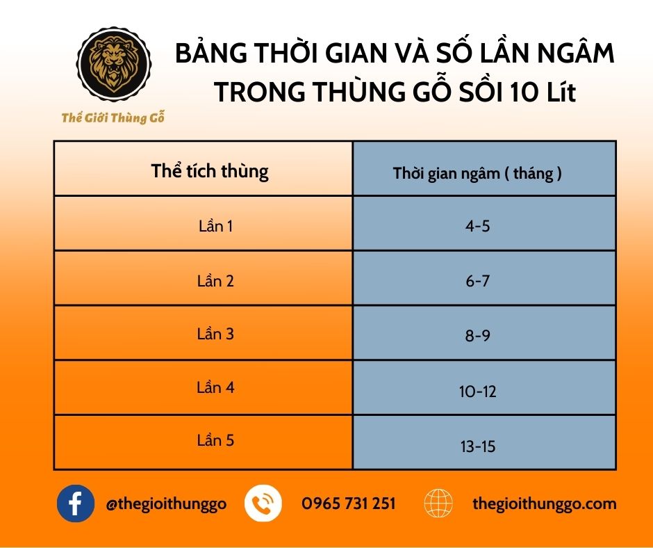 Dưới đây là bảng thời gian và số lần ngâm trong thùng rượu gỗ sồi 10 Lít